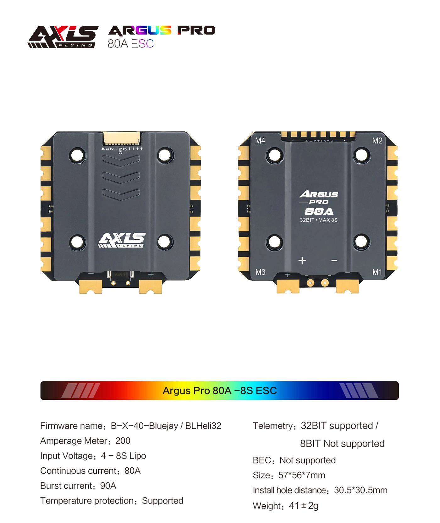 The Axisflying Argus Pro 80A is a flagship 32-bit FPV ESC with BLHeli_32 firmware. Encased in a CNC heat sink, this Axisflying 80A ESC offers elite-grade precision for 3-6S professional builds.